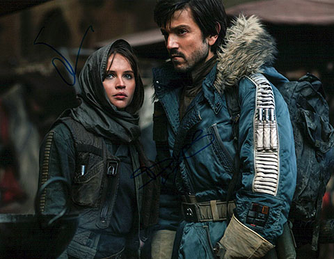 Cool 11x14 scene shot of Jyn and Cassian arriving in town, signed by Felicity Jones and Diego Luna.