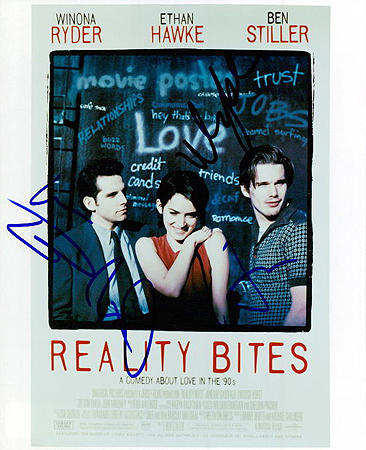 Nice photo of the poster for Reality Bites signed in-person by Ethan Hawke, Winona Ryder and Ben Stiller.